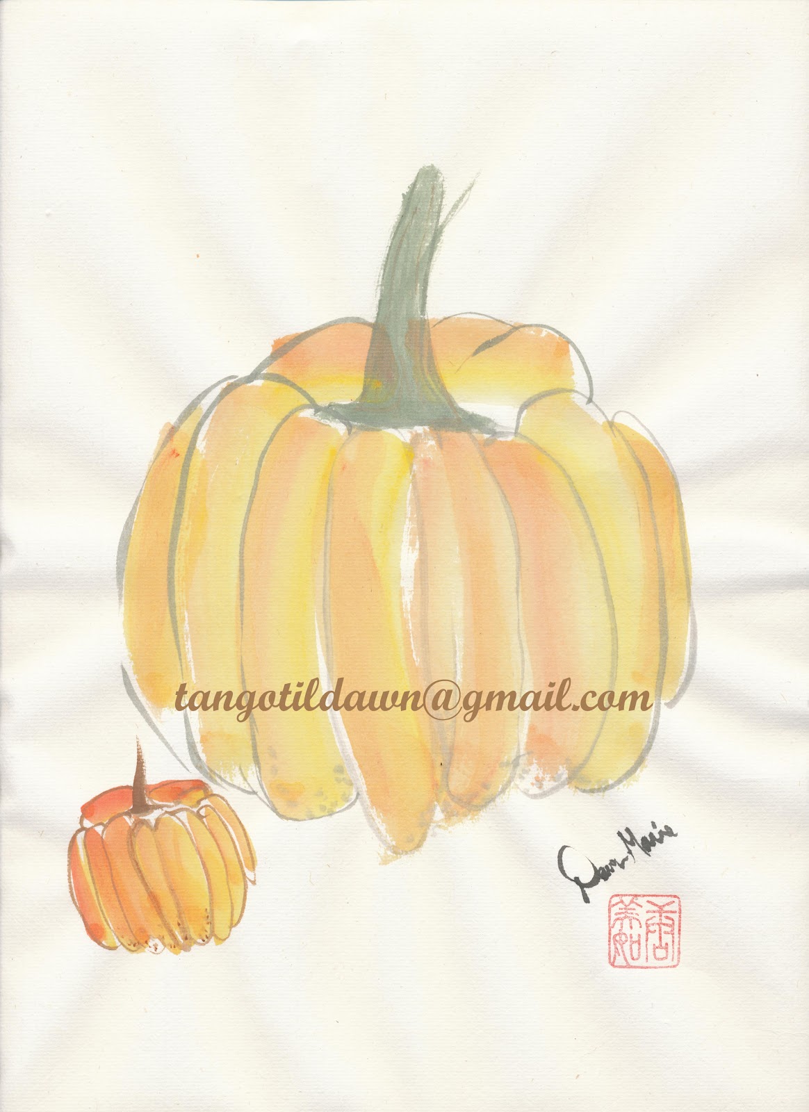It's a two'fer this weekend! I was in the mood to paint pumpkins, the Harvest Pumpkin was the first and then the Fruits of Fall came along after. The second is more in line with the traditional Chinese brush painting style. The first was not in actual brush painting style, but with the brushes, paper, and the paints of course.